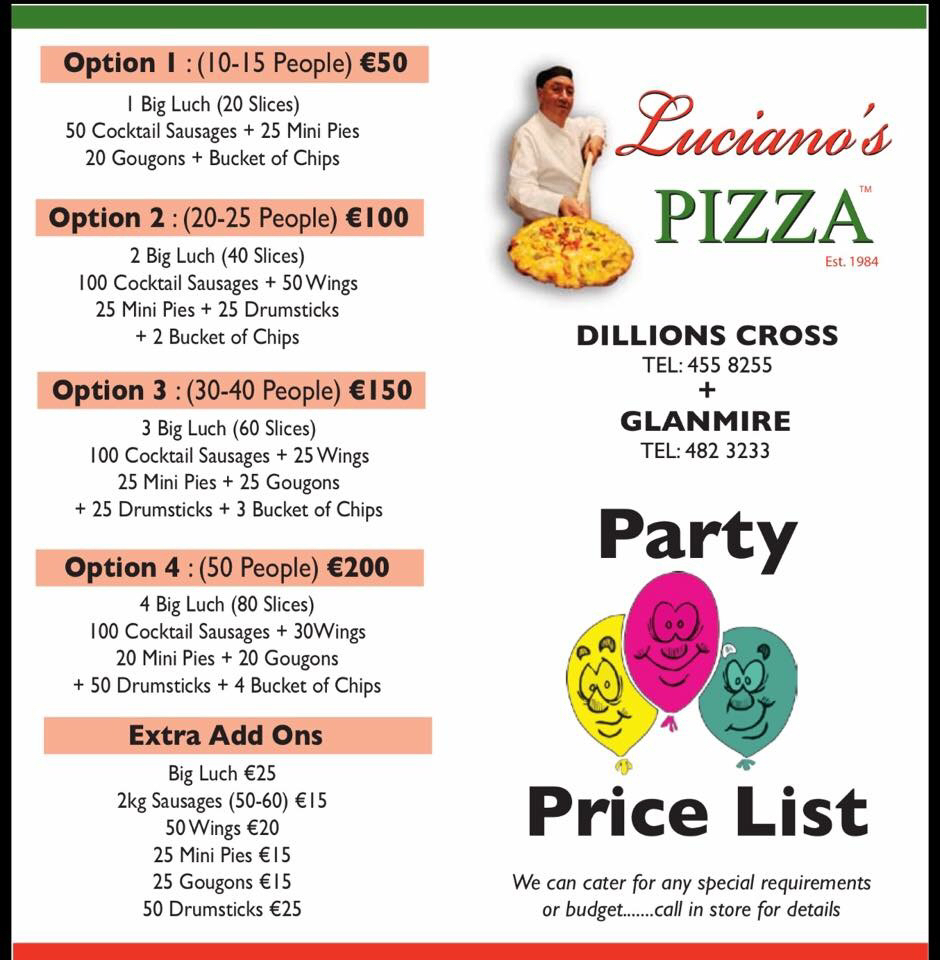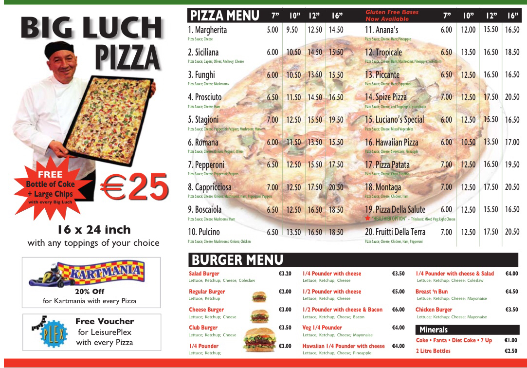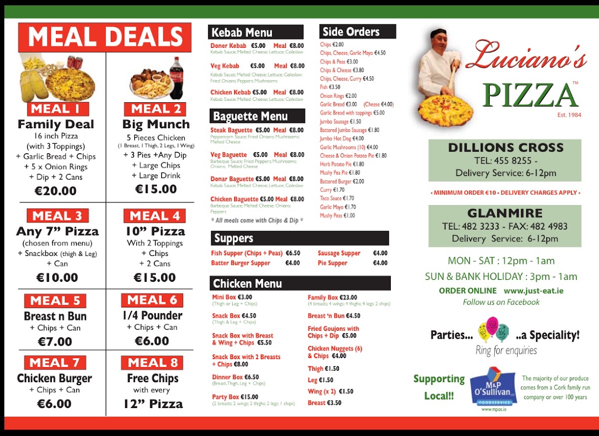 The menu at Luciano's Pizza in Riverstown offers a delightful variety of traditional Italian dishes, each crafted to deliver a satisfying dining experience. One of the standout items on the menu is the Margherita Pizza, a classic choice that is simple yet full of flavor, showcasing a perfect balance of fresh mozzarella, tomatoes, and basil. It captures the essence of Italian pizza with its thin, crispy crust and authentic toppings.